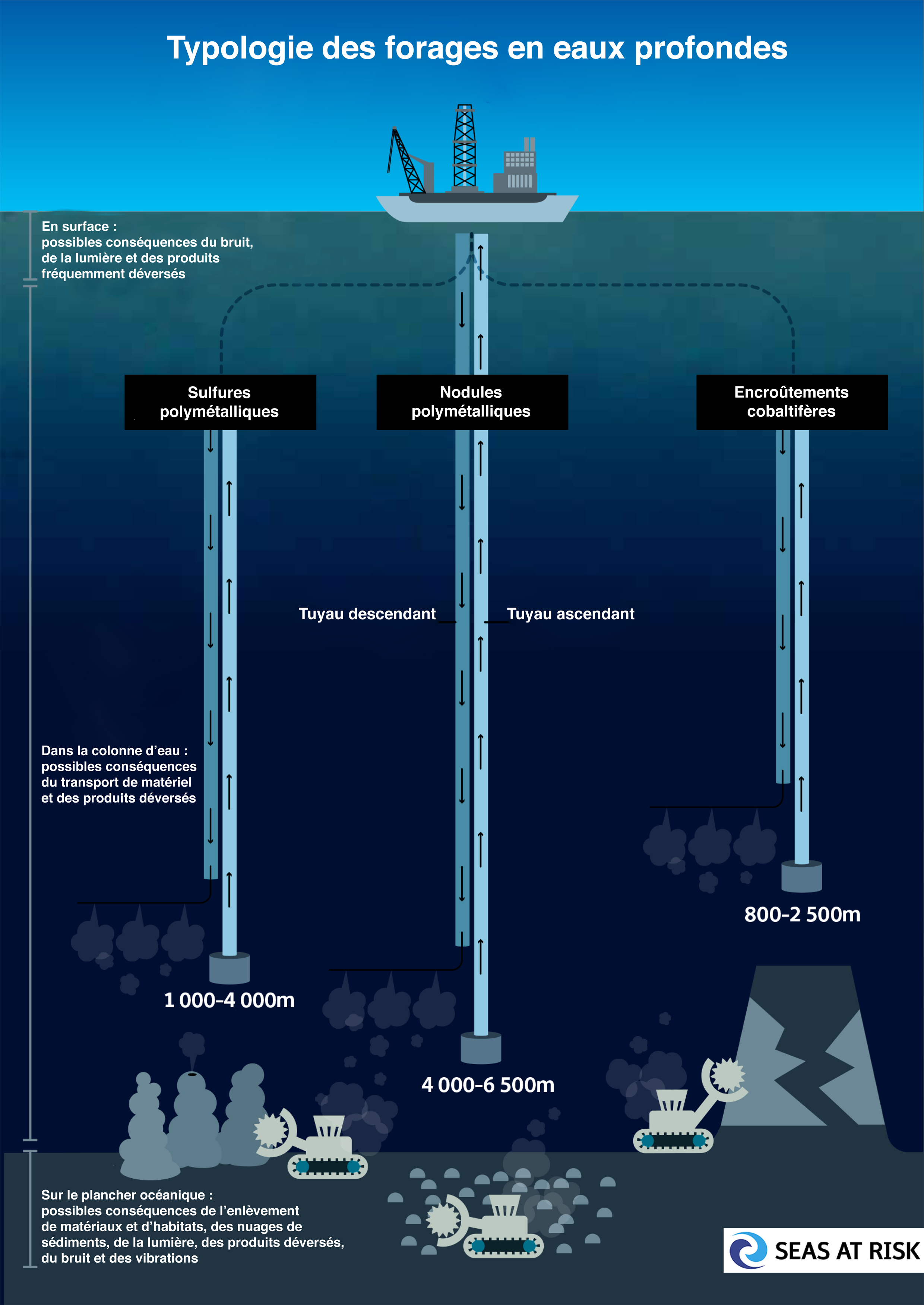 Le deep sea mining désigne l’extraction de minerais dans des zones maritimes situées à des profondeurs allant de 1 400 à 6 000 mètres. La liste des matières premières à miner est longue : or, argent, cuivre, manganèse, cobalt, zinc, nickel, plomb, lithium et terres rares. Trois types de gisements sont ciblés : les nodules polymétalliques, des concrétions rocheuses présentes par milliards dans la zone Clarion-Clipperton du Pacifique Nord, les sulfures polymétalliques hydrothermaux, présents dans des zones géologiques actives, et les encroûtements cobaltifères, très difficiles à miner.