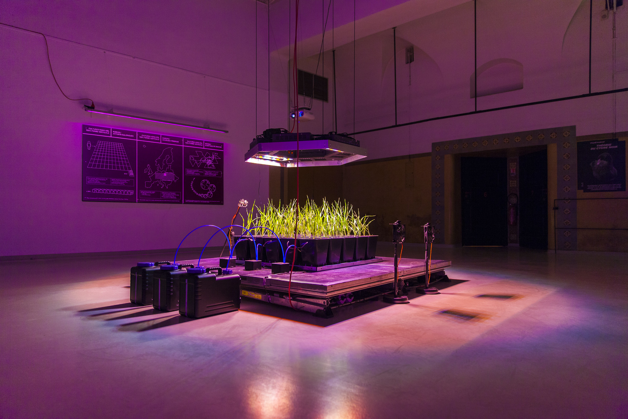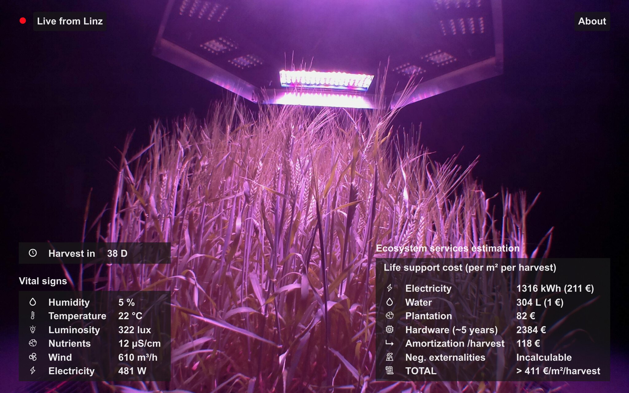 À partir de sources scientifiques et d’outils d’ingénierie agricole, Life Support System a tenté de comptabiliser ce dont un mètre carré de blé a besoin pour pousser (eau, lumière, nutriments) et en a évalué le coût, bien supérieur à son prix sur les marchés mondiaux (0,15€). Cette estimation vient souligner combien la valeur économique est disjointe de la réalité écologique et fait apparaître l’inadéquation de l’économie à rendre compte des dynamiques et du travail du vivant. Le projet met ainsi en tension, d’un côté, le besoin de faire appel à des méthodes de quantification pour rendre visibles des phénomènes naturels et climatiques et, de l’autre, l’effacement du monde réel par la multiplication des modèles de calcul – ou ce que le philosophe Vilém Flusser nomme « la déshydratation » des phénomènes sensibles lorsqu’ils deviennent des symboles mathématiques. Réduit et dévalorisé, le vivant tend à disparaître dans l’ombre des chiffres et des images techniques qui les représentent. La finalité de Life Support System n’est pas de convertir des phénomènes biophysiques en données mais de faire sentir des ordres de grandeur, en les matérialisant plastiquement, et de traduire des interdépendances. La méthodologie du projet emploie, de manière oblique et empirique, des méthodes comptables de prédiction des rendements agricoles à partir de modèles tirés des sciences de l’environnement. Elle s’appuie sur des estimations calculées à partir des capacités d’absorption de la biosphère qui sont des hypothèses. Elle rappelle enfin que notre perception des dynamiques planétaires, telles que le climat, dépend d'un arsenal de capteurs et d’interfaces technologiques. Il ne s’agit pas dès lors de rejeter toute tentative de projection mathématique et les calculs en bloc – ces instruments s’avèrent utiles à bien des égards –, mais de pointer les dérives d’une Économie (avec majuscule) abstraite, présentée comme une doctrine infaillible et que le philosophe Bruno Latour décrit comme l’« amplification fabuleuse de certains calculs ». Les calculs effectués ici cherchent avant tout à susciter des débats et non à les clore.