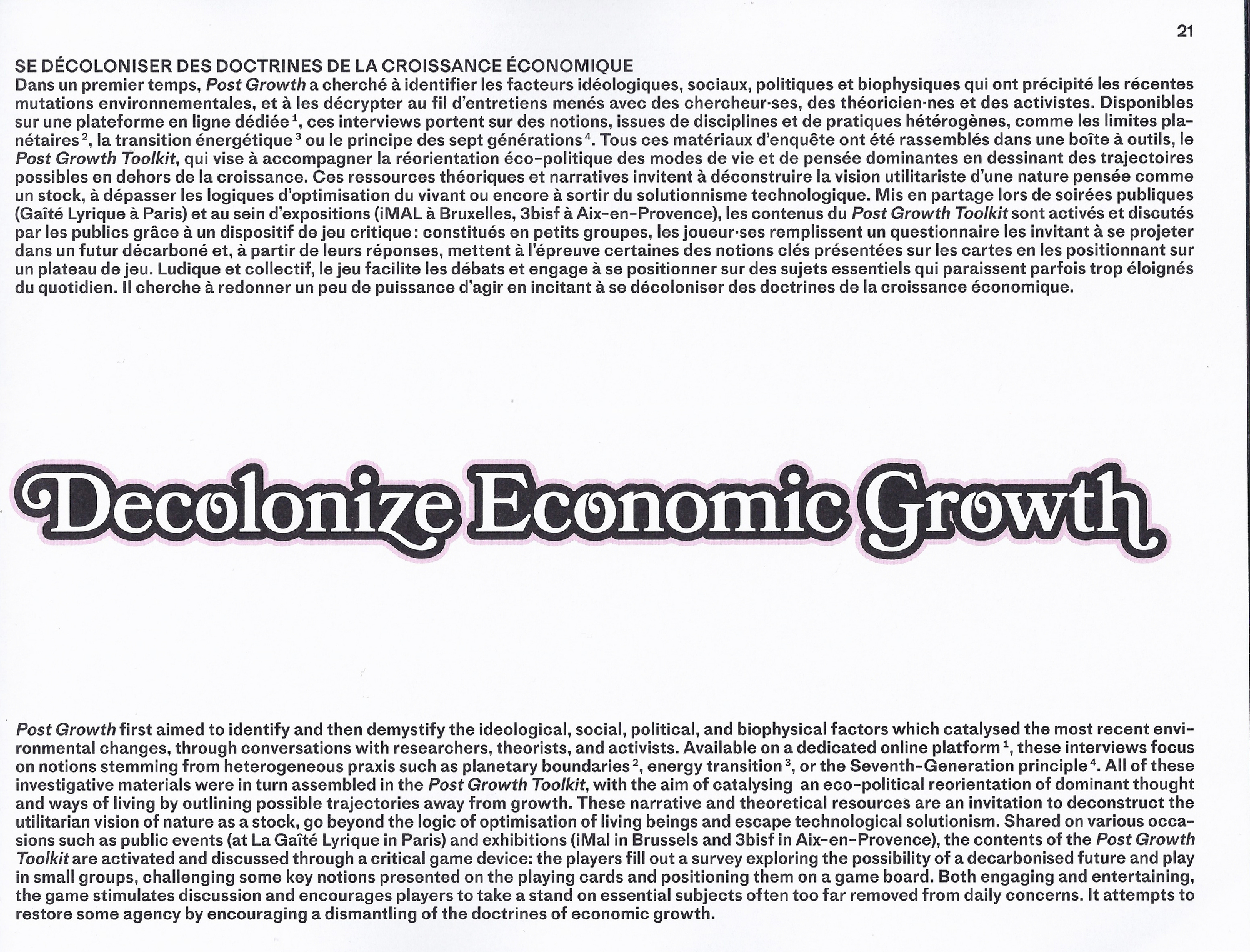 Dans un premier temps, Post Growth a cherché à identifier les facteurs idéologiques, sociaux, politiques et biophysiques qui ont précipité les récentes mutations environnementales et à les décrypter au fil d’entretiens menés avec des chercheur·ses, des théoricien·nes et des activistes. Disponibles sur une plateforme en ligne dédiée, ces interviews portent sur des notions, issues de disciplines et de pratiques hétérogènes, comme les limites planétaires, la transition énergétique ou le principe des sept générations. Tous ces matériaux d’enquête ont été rassemblés dans une boîte à outils, le Post Growth Toolkit, qui vise à accompagner la réorientation éco-politique des modes de vie et de pensée dominants en dessinant des trajectoires possibles en dehors de la croissance. Ces ressources théoriques et narratives invitent à déconstruire la vision utilitariste d’une nature pensée comme un stock, à dépasser les logiques d’optimisation du vivant ou encore à sortir du solutionnisme technologique. Mis en partage lors de soirées publiques (La Gaîté Lyrique à Paris) et au sein d’expositions (iMal à Bruxelles et 3bisf à Aix en Provence), les contenus du Post Growth Toolkit sont activés et discutés par les publics grâce à un dispositif de jeu critique : constitués en petits groupes, les joueur·ses remplissent un questionnaire les invitant à se projeter dans un futur décarboné et, à partir de leurs réponses, mettent à l’épreuve certaines des notions clés présentées sur les cartes en les positionnant sur un plateau de jeu. Ludique et collectif, le jeu facilite les débats et engage à se positionner sur des sujets essentiels qui paraissent parfois trop éloignés des concernements du quotidien. Il cherche à redonner un peu de puissance d’agir en incitant à se décoloniser des doctrines de la croissance économique.