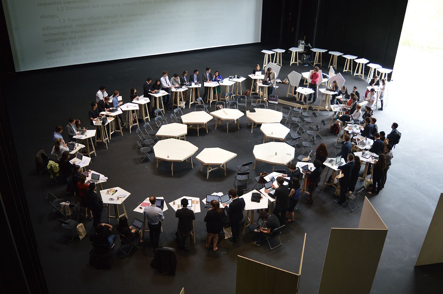 Le Théâtre des négociations s'est tenu à la fin du mois de mai à Nanterre-Amandiers. Organisé par Sciences Po dans le cadre du programme Make It Work, il rassemblait 210 étudiants du monde entier et jouait six mois en avance, après en avoir revisité les règles, la 21e conférence climat organisée à Paris en décembre. Déplacé dans un théâtre, lieu de la représentation, ce jeu de rôle grandeur nature était ouvert trois jours durant au public. La simulation s'est révélée être de l'intérieur une véritable expérience de pensée aux dimensions politiques, artistiques et pédagogiques.
